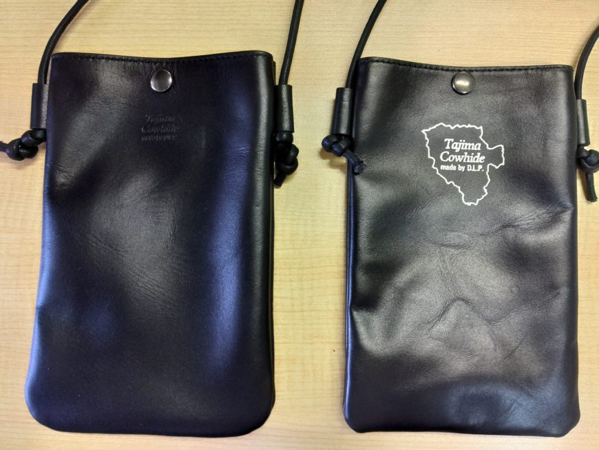 通常のTajima Cowhideスマホポーチは左の物で箔押しではなく素押しなのでレアといえばレアです(笑)