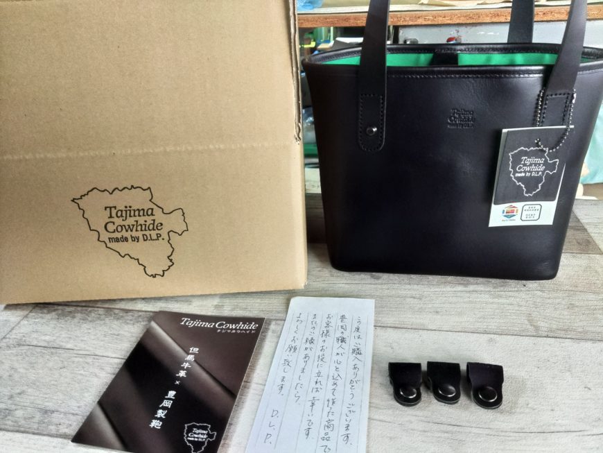前にもお伝えしていましたが、兵庫県と豊岡市のふるさと納税返礼品、自社販売サイトに注文していただいた方には、お礼の手紙とバッグと同じ但馬牛の革で作ったコードクリップをお付けしています。