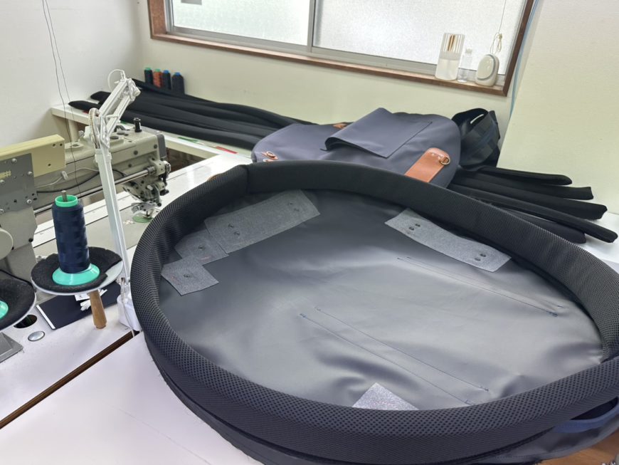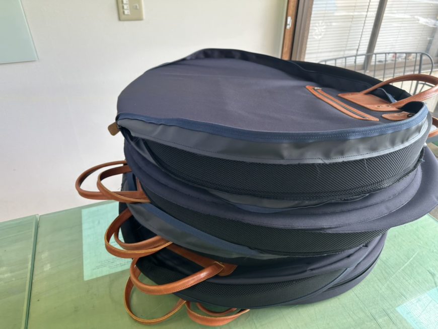 抜型が作れないほどのサイズなので抜型が作ることもできず、作れたとしてもプレスで裁断ができないほどの大きさなので、縫製も通常のバッグのような縫い方もできない。