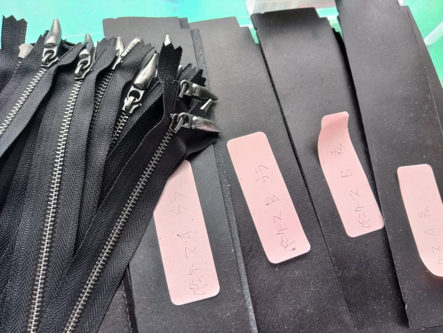 裁断も終わって、角型引手もファスナーに取り付けてここまで作業は進んだけど、他の作業が詰まっていて去年から止まっている…