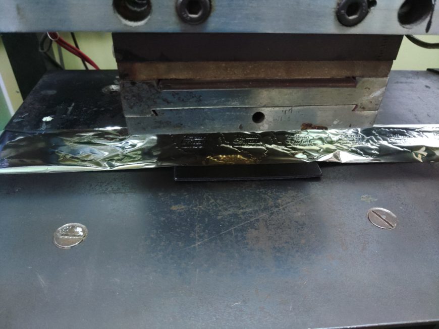 Tajima Cowhideシリーズの商品につけている革のタグの箔押しをしています。