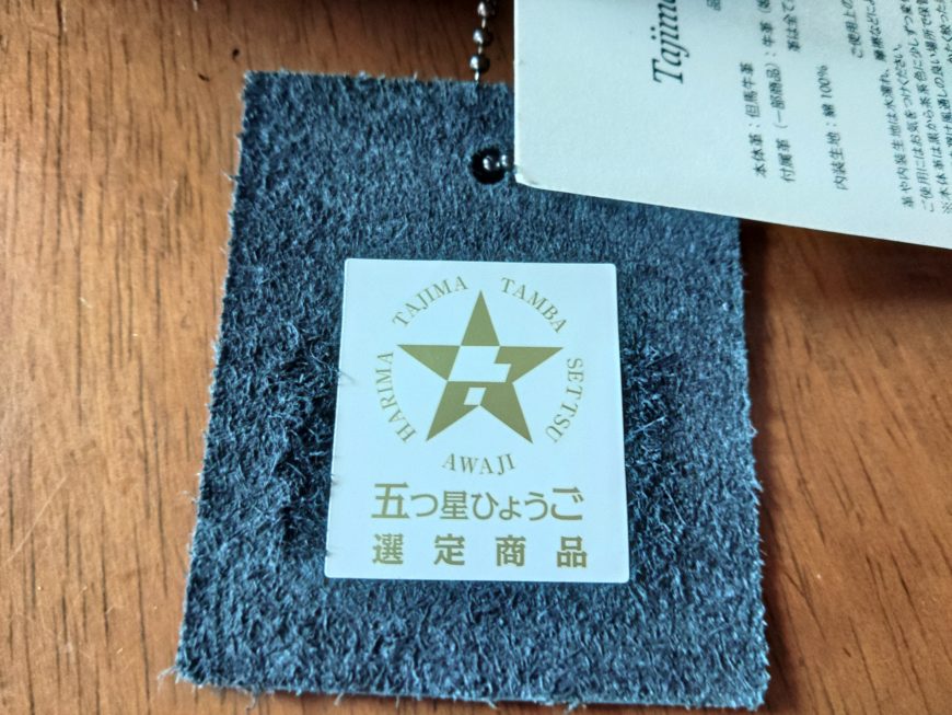 Tajima Cowhideシリーズの中で兵庫県の選定商品五つ星ひょうごに登録された商品には裏側に五つ星ひょうご公式のシールを貼っています