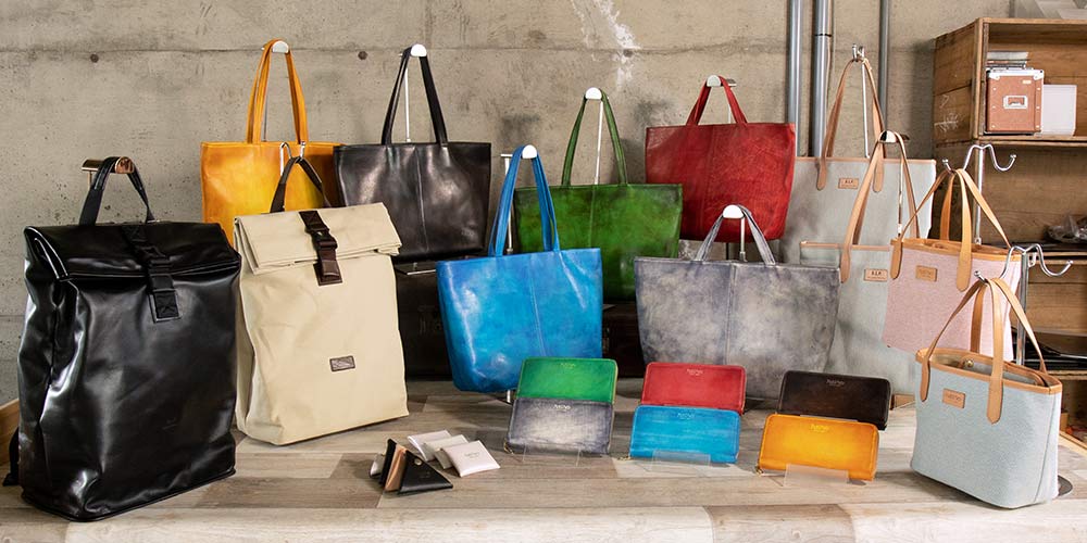 国内のタンナー技術と豊岡のバック職人の技術を融合したオリジナル商品。製品手染め(パティーヌ染)のパティーヌシリーズ。防水革&超撥水糸で縫製した防水革シリーズ。優しくさわやかな帆布とヌメ革を使ったバッグなど、他社にないオリジナル商品を作っています。
