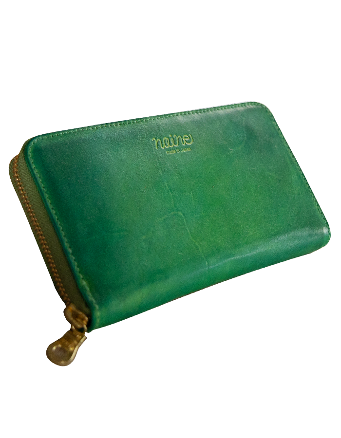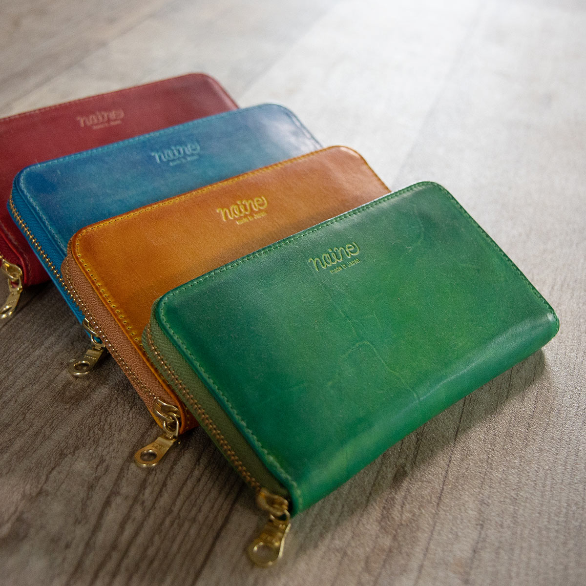パティーヌ技法と呼ばれる複数回製品手染めを施した商品です。その手染めは透明感があり奥行きのある染料を調合して幻想的な演出をしています。1本1本表情が違うため持つ人のオンリーワンのアイテムになると思います。外装だけでなく内装も本革を使用しているので高級感があります。豊岡の財布職人と姫路レザーの染色技術の融合した逸品です。